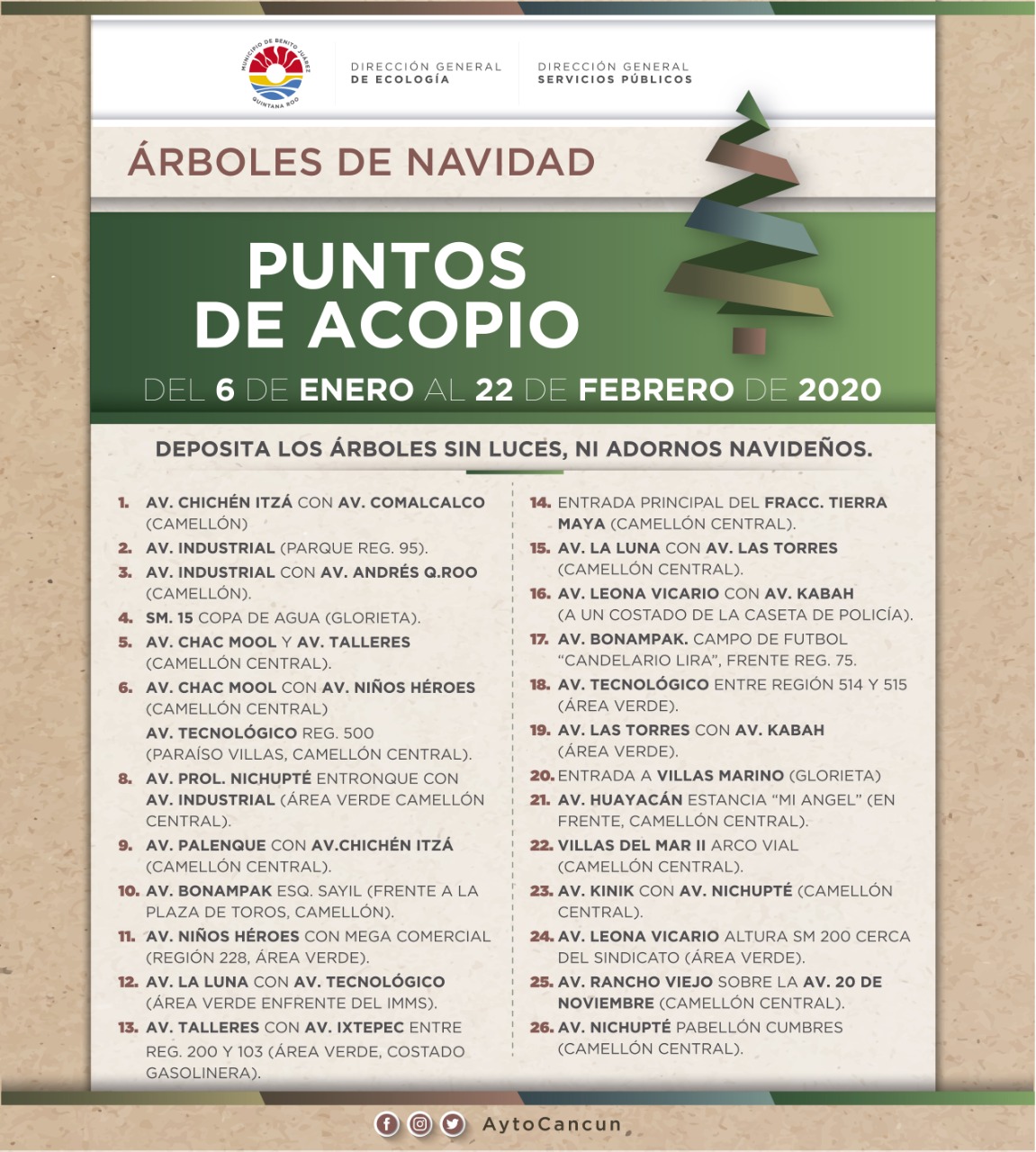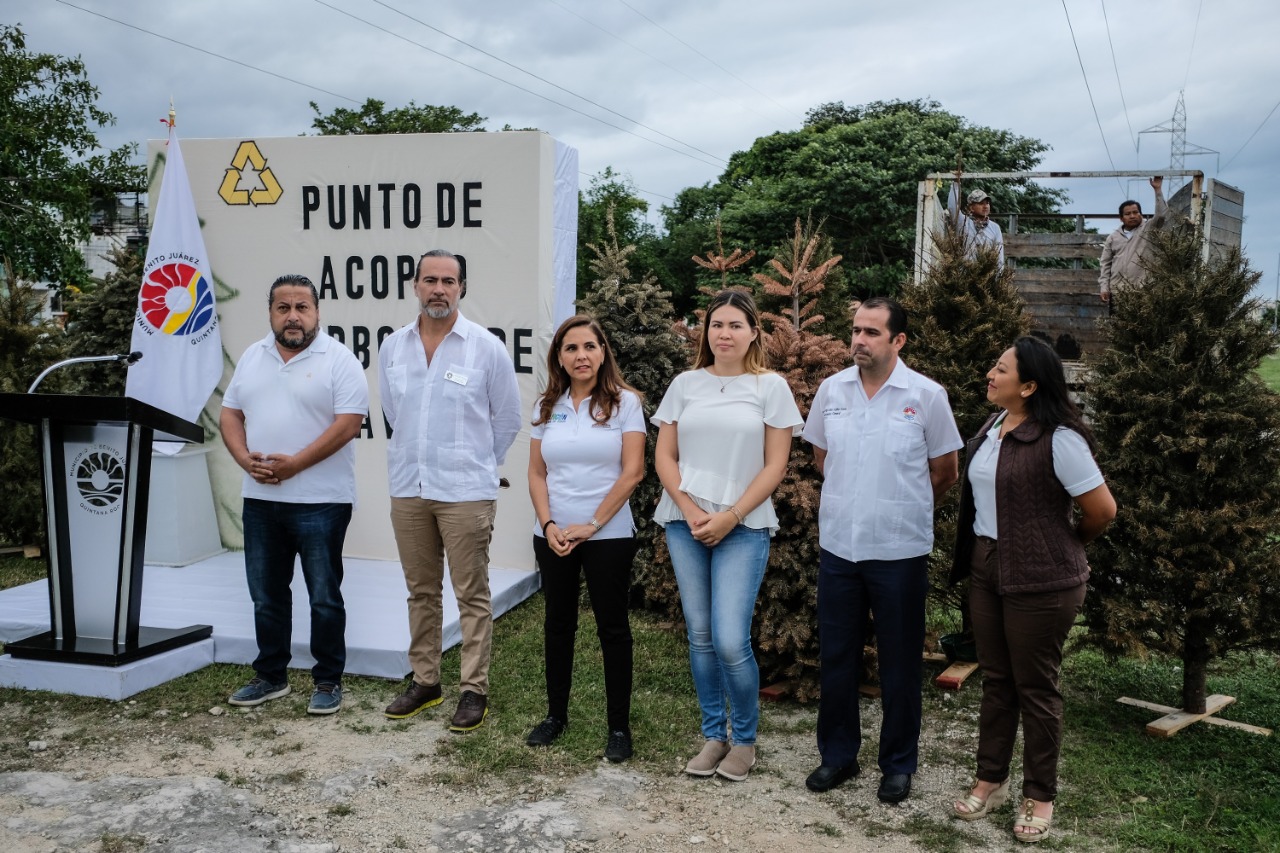 La alcaldesa de Benito Juárez dio a conocer que para facilitar la correcta disposición de los árboles navideños, se instalaron 26 puntos de acopio ubicados de forma estratégica en diferentes partes de la ciudad, principalmente en camellones y áreas verdes, debidamente identificados con lonas.