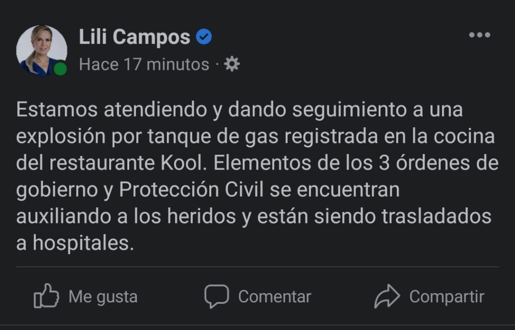 La presidenta municipal Lili Campos informó que se atiende a los lesionados y se les está trasladando a hospitales.