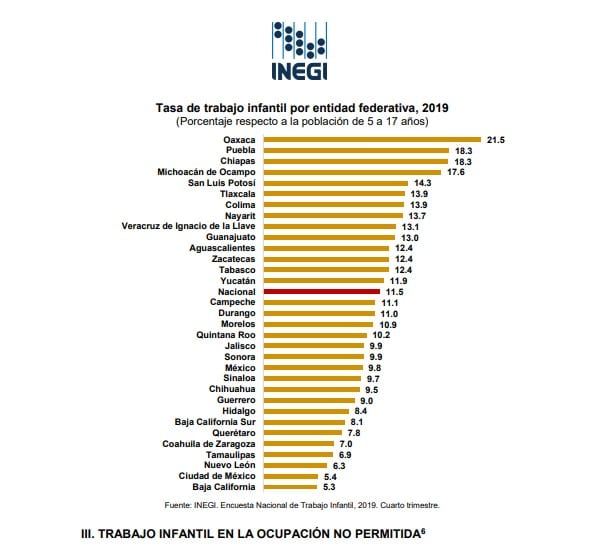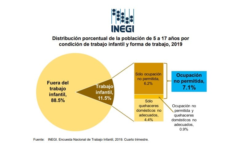 «De esos 3.3 millones de menores trabajadores, 2.8 millones lo hacen en el sector informal. Esto significa que los tres niveles de gobierno deben centrar parte de la agenda estatal en la prevención y erradicación del trabajo infantil, con la finalidad de disminuir considerablemente los factores que inducen a la población infantil y adolescente, o a sus familias, a salir de casa para trabajar», resaltó.