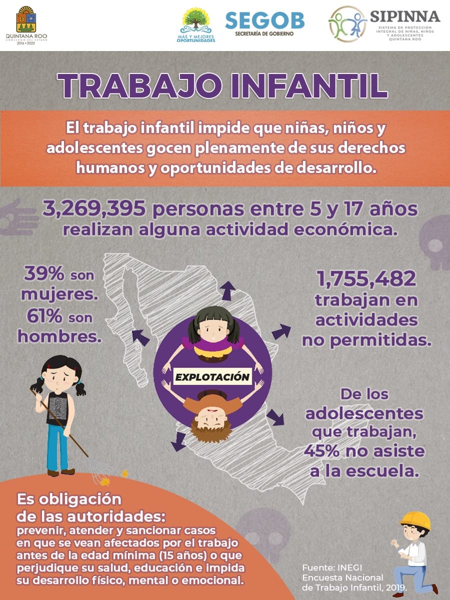 «Es necesario mostrar que el trabajo infantil tiene consecuencias físicas, psicológicas y educativas para las niñas, niños y adolescentes como lesiones, amputaciones, intoxicaciones, envenenamiento, insolación, estrés, baja autoestima, traumas, embarazo infantil, bajo rendimiento escolar, deserción, ausentismo, violencia sexual, matrimonio infantil, por lo que debemos multiplicar esfuerzos para la erradicación del trabajo infantil y proteger los derechos de las y los adolescentes trabajadores en edad permitida fortaleciendo la cultura de denuncia marcando al 089 o al 911 para realizar reportes de menores en condición de trabajo».