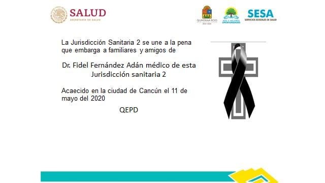 Horas después, a través de una nueva esquela, la Secretaría de Salud informó del fallecimiento del doctor Fidel Fernández Adán, ocurrido hoy en Cancún.