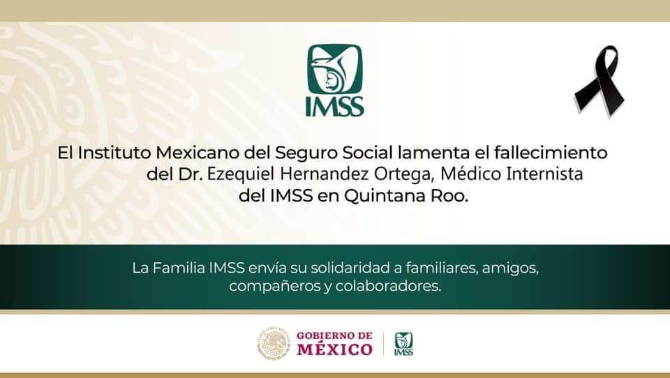 La Secretaría de Salud de Quintana Roo, a través de la cuenta de Facebook de Jurisdicción Sanitaria 2, extendió hoy sus condolencias por el fallecimiento del Doctor Ezequiel Hernández Ortega, quien laboraba en el IMSS y el Hospital General de Cancún. El médico murió ayer y hoy se dio la noticia.