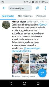 Una triste verdad que desgraciadamente las autoridades minimizan, el robo a casa habitación es algo realmente grave que día a día crece en #Cancun (sic) las autoridades se limitan a decir que están trabajando en ello pero no hay resultados en cambio está incontrolable”, expone la cuenta de Twitter @AlamosVigias.