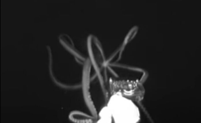 Y fue hasta el día siguiente cuando los investigadores revisaron la grabación de Medusa, que entre camarones y otros animales pequeños avistaron en el video los largos tentáculos de un Architeuthis dux atraído por las luces trampa del sumergible.