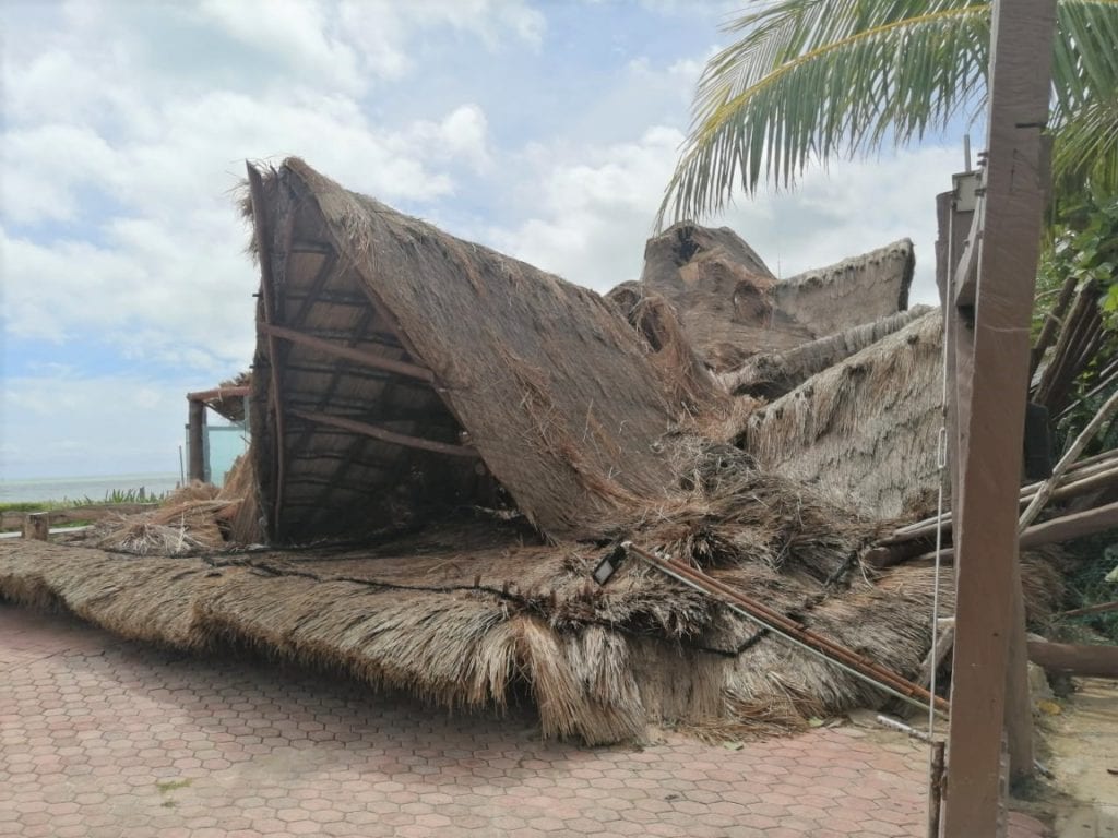 El espacio, utilizado para oficiar bodas y diversos eventos, quedó casi completamente destruído, al romperse sus vigas principales y quedar el techo de la palapa en toda su parte frontal caído en el suelo, recostado sobre su lado izquierdo.