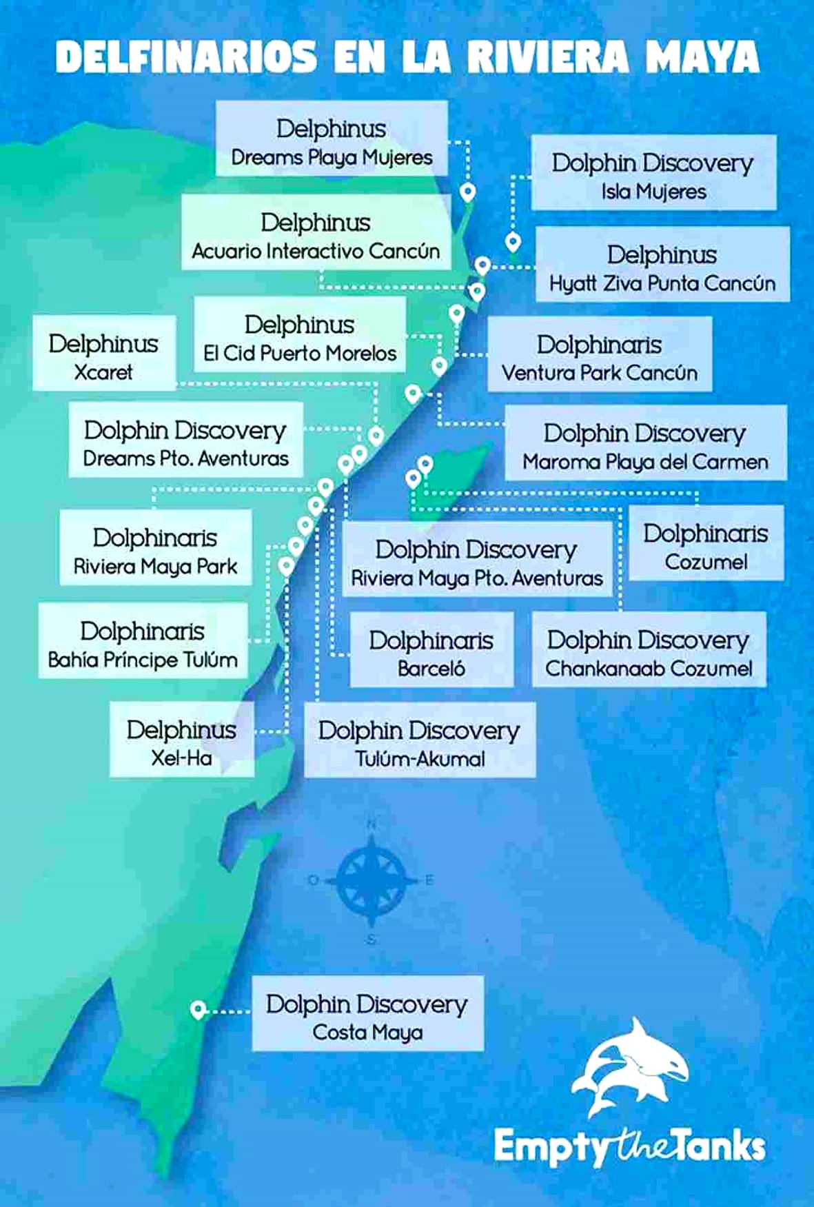 Empty the Tanks evidencia que en Quintana Roo jay tres empresas de nado con delfines: Dolphinaris, Delphinus y Dolphin, que operan las 19 instalaciones de nado en cautiverio que hay en la entidad.