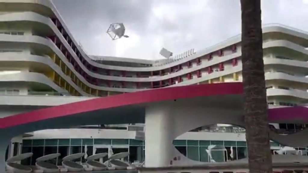 Aunque a simple vista no parece ser de gran intensidad bastó para arrojar algunos objetos del bar de la playa y cojines de los camastros. Y sí, como vemos, ya casi al final del video, arroja lo que parece ser un camastro contra la estructura del hotel.