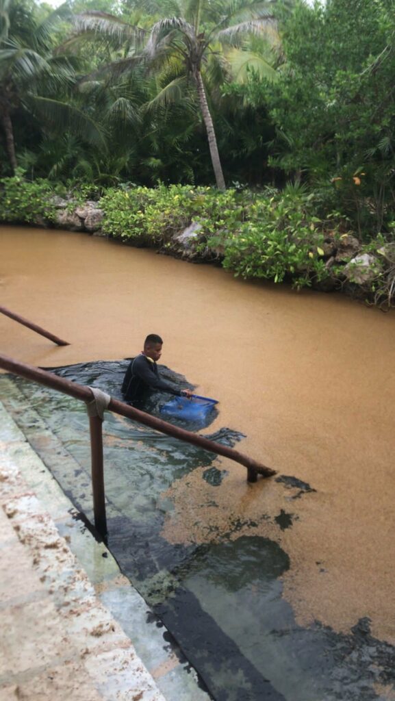 Esta otra imagen es insólita. El agua del parque de Xcaret luce completamente café, sucia. No hay ni un solo punto donde se vea el azul característico. Fue sin duda un fin de semana complicado para los trabajadores y para el turismo.