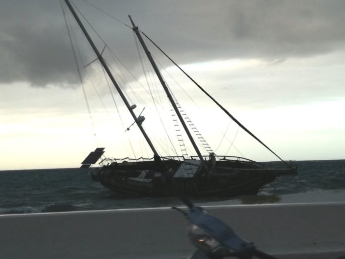 El hecho ocurrió alrededor de las 18 horas, cuando por el viento se rompieron las ataduras y el velero fue a parar frente al malecón entre las calles 4 y 6.