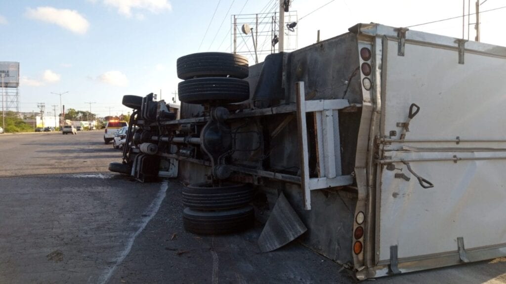 Un camión de carga acabó volcado esta mañana sobre uno de sus costados en el bulevar Luis Donaldo Colosio de Cancún