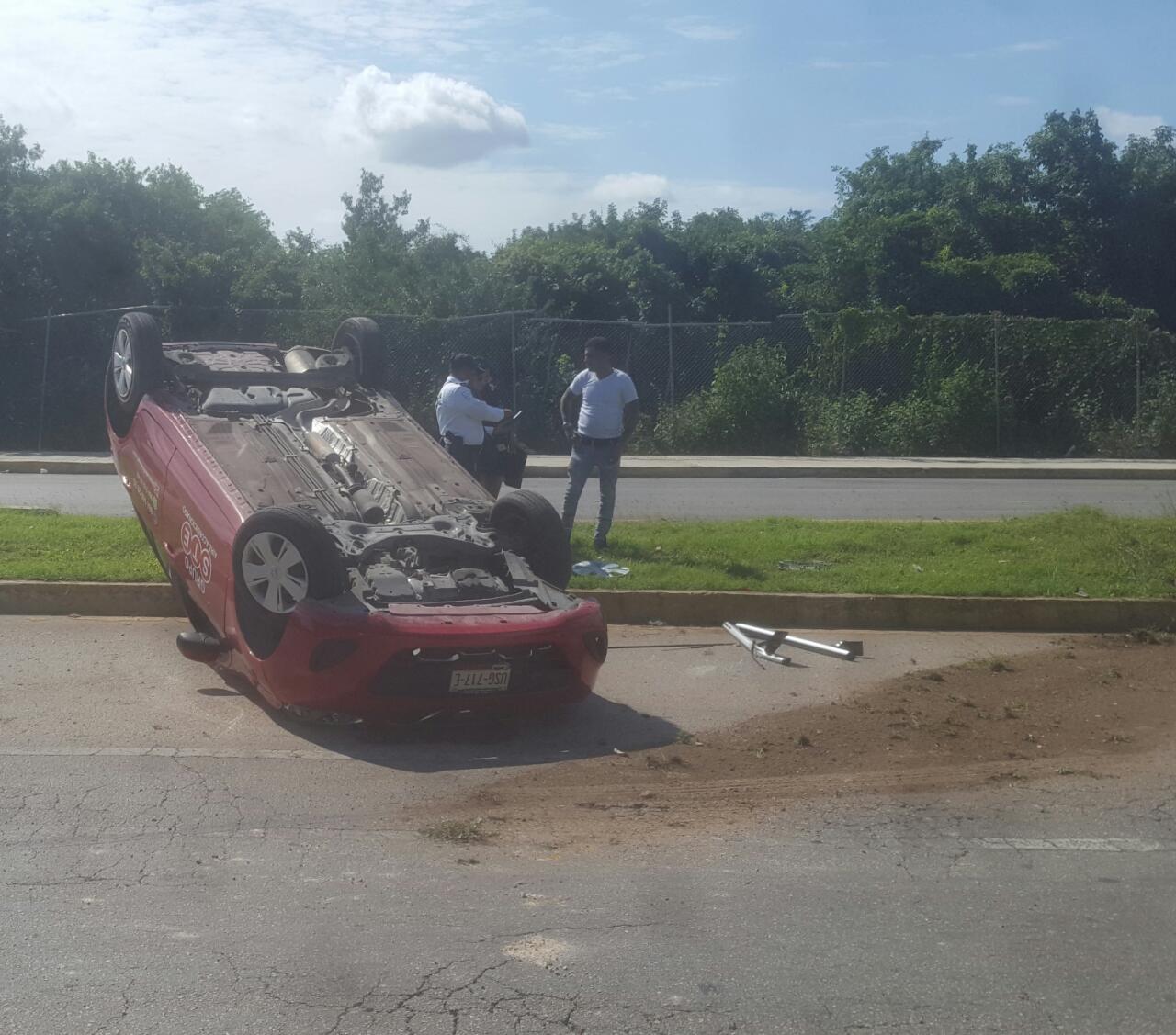 Playa del Carmen.- Uno automóvil acabó volcado sobre el Arco Vial, a la altura del fraccionamiento Villamar 2, sin heridos que lamentar.