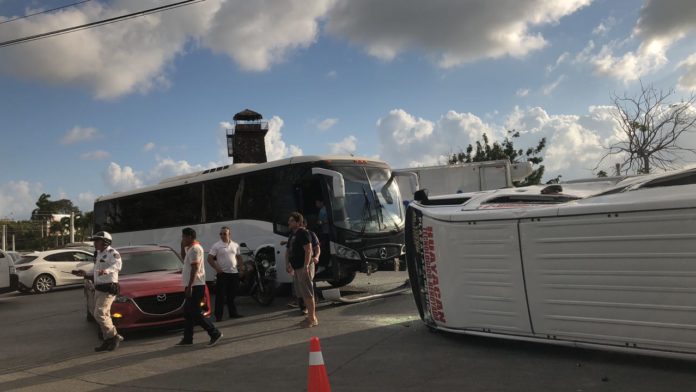 Cancún.- Una combi de la concesionaria La Franja, volcó en el Distribuidor Vial, accidente que dejó a 22 personas heridas, debido a que iba con sobrecupo.