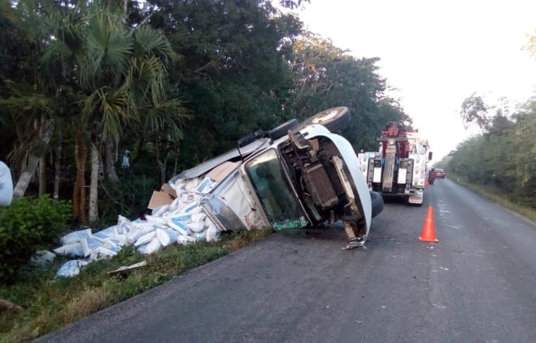 Taxistas de Nuevo X-Can se quejaron de que es segunda vez en el mes que un camión acaba accidentado en este tramo, que además de ser muy estrecho, no está debidamente pintado, tema que debiera atender la Secretaría de Comunicaciones y Transporte.