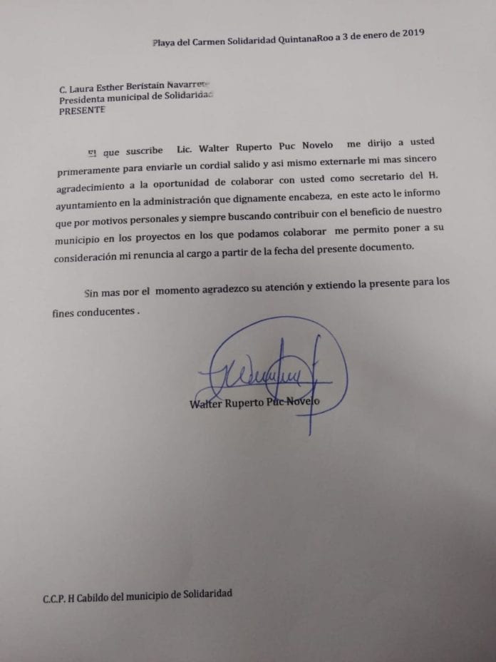 Playa del Carmen.- Se confirma la renuncia de Walter Puc Novelo a la secretaría general del Ayuntamiento de Solidaridad, dada por escrito a la presidenta municipal, Laura Beristain Navarrete, con copia para el Cabildo, en la que aduce “motivos personales”.