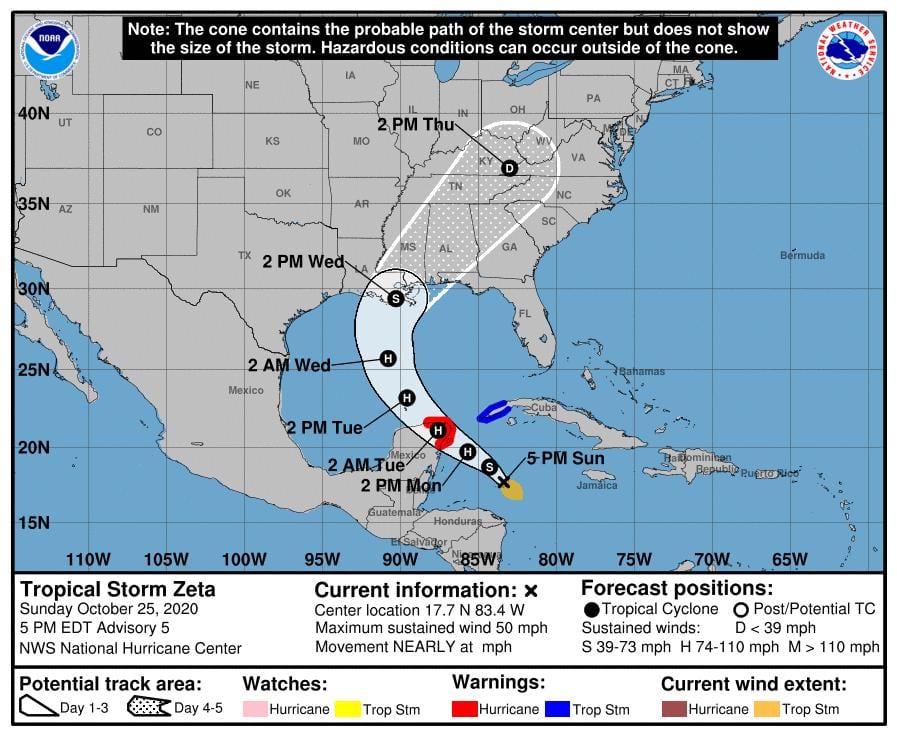 Tormenta Tropical “ZETA”, el cual se ubica aproximadamente a 340 kilómetros, al sureste de la isla de Cozumel, Quintana Roo, presenta movimiento al noroeste a razón de 15 kilómetros por hora, con vientos máximos cerca del centro de 110 kilómetros por hora, con rachas mayores.