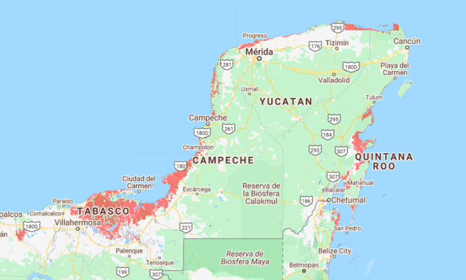 Cancún parece salvarse en su mayor parte, salvo por algunos puntos específicos, como Puerto Cancún. Todo lo contrario a Puerto Morelos, cuyos manglares cerca del casco antiguo quedarían bajo el agua, donde se erigió, en medio de protestas ambientales, hoteles como El Cid y Now Jade.