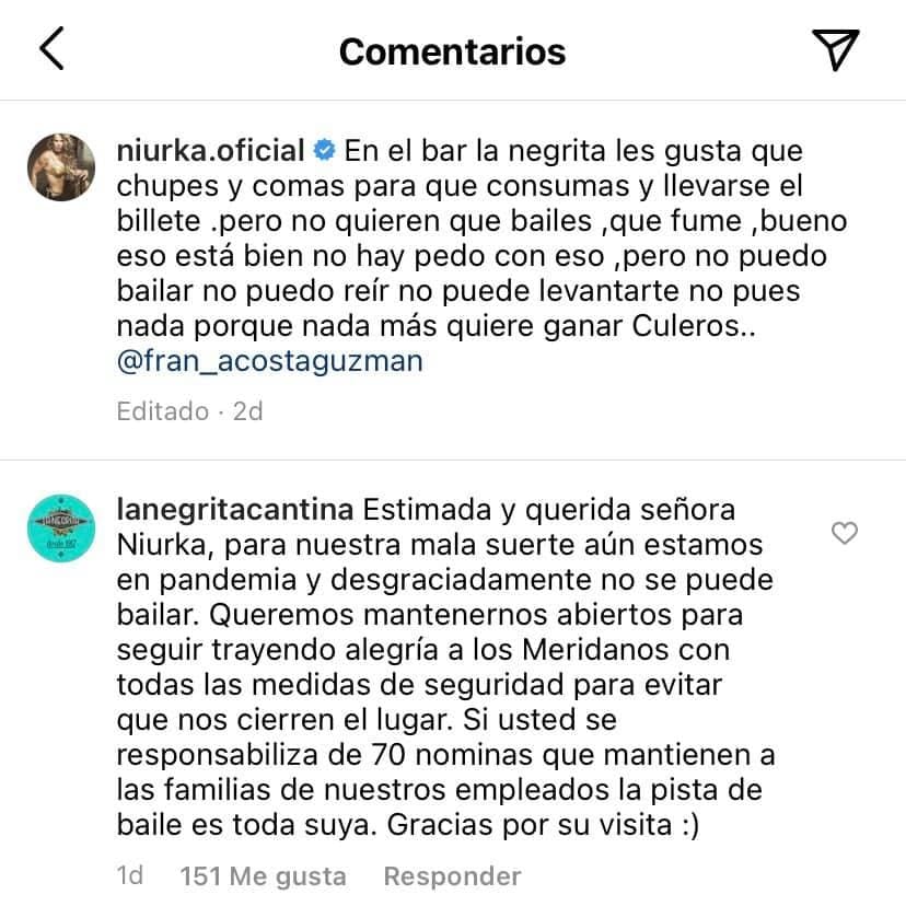 Pero la respuesta más contundente fue la del bar La Negrita Cantina, que le escribió a la cubana: “Estimada y querida señora Niurka, para nuestra mala suerte aún estamos en pandemia y desgraciadamente no se puede bailar. Queremos mantenernos abiertos para seguir trayendo alegría a los Meridanos con todas las medidas de seguridad para evitar que nos cierren el lugar. Si usted se responsabiliza de 70 nominas que mantienen a las familias de nuestros empleados la pista de baile es toda suya. Gracias por su visita”.