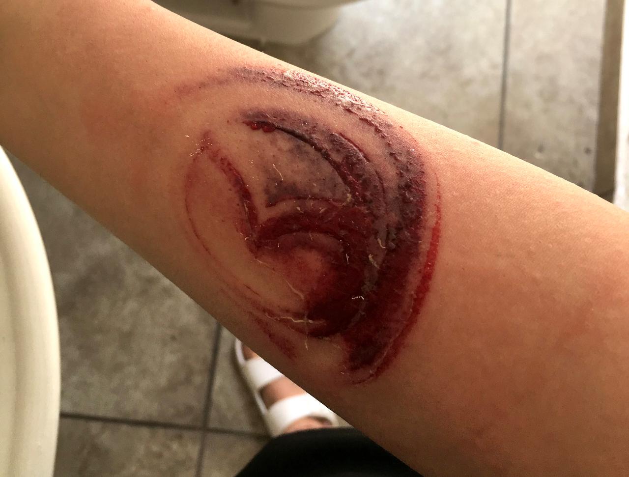 Explicó que al sufrir el accidente se dio cuenta que las bolsas de aire salen directo del volante, y como salen a presión hacen que el sello se caliente. Y fue con el logo de Mazda del vehículo que se quemó, y lo que le dejó la marca.