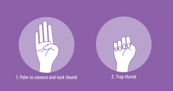 El gesto consiste en levantar la mano, mostrando la palma con el pulgar extendido, y luego situarlo encima de la palma y bajar los dedos sobre él, como para atraparlo. Es una manera de avisar de que se está sufriendo violencia machista sin tener que verbalizarlo, algo que podría poner en peligro a la víctima.