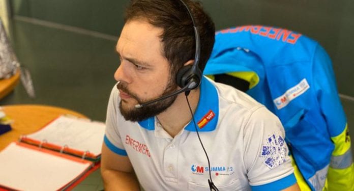“Hola mi mamá cayó en el suelo y no sé qué le pasa. Está entre dormida y despierta”, dice el niño al hombre de emergencias.