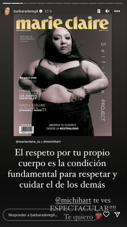 Decenas de colegas aplaudieron el mensaje de empoderamiento de Michelle Rodríguez, entre ellas Bárbara de Regil, quien dedicó varios emoticones de ojos enamorados a la publicación de la revista que protagoniza Michelle.