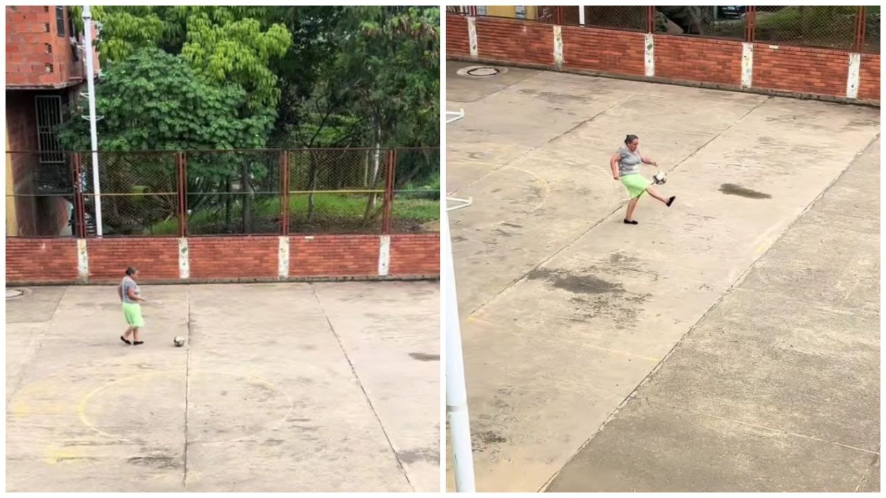 En redes sociales se hizo viral un video en donde se puede ver a una abuelita jugando fútbol con su nieto en una cancha comunitaria.
