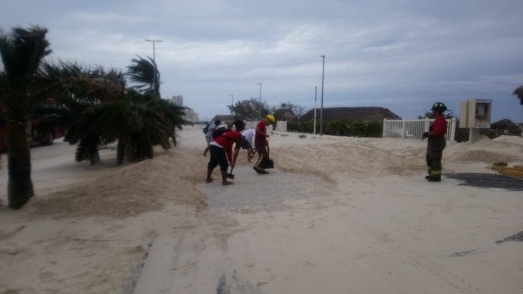 Elementos del H. Cuerpo de Bomberos, de la Dirección de Protección Civil y de la Policía Turística del Ayuntamiento Benito Juárez trabajan para liberar los carriles del bulevar y regresar la arena a su sitio, siempre bajo la vigilancia de la Zona Federal Marítimo Terrestre (Zofemat), pues esta tiene que estar limpia.