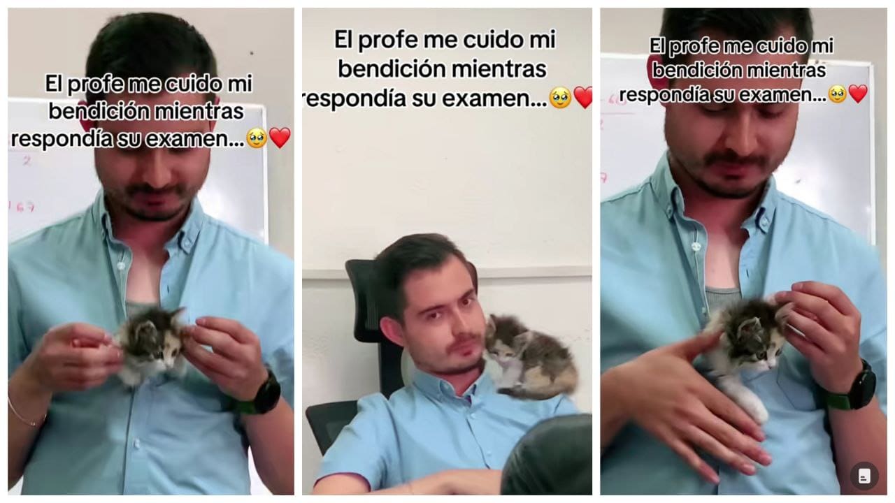 La usuaria de TikTok @sherlyn_franco__ compartió hace una semana un tierno video en el que se ve a su profesor ocupándose del bienestar del pequeño gatito con el que se presentó a clase. “El profe me cuidó mi bendición mientras respondía su examen”, aclaró la joven.