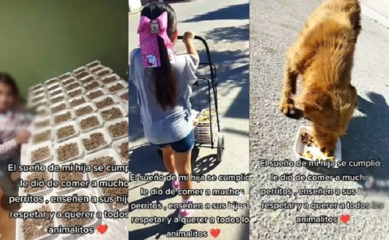 “El sueño de mi hija se cumplió, le dio de comer a muchos perritos”, se lee en un texto que aparece en el video de la niña que le da de comer a perritos callejeros. “Enseñen a sus hijos a respetar y a querer a todos los animalitos”, mencionó la mujer.