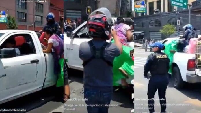 A través de redes sociales, el video muestra el momento exacto en que Marven, mejor conocida como ‘Lady Tacos de Canasta’ se sube como puede a una camioneta presuntamente de la alcaldía Cuauhtémoc donde se llevan su mercancía.