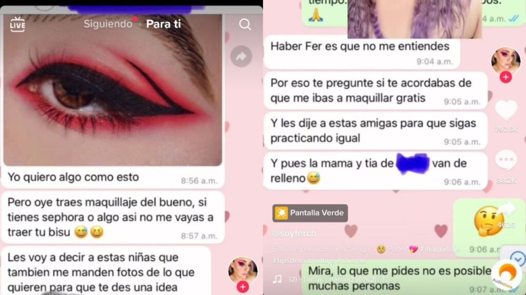 Se trata de la tiktoker y maquillista profesional ‘Soy Ferch’, quien se enfrentó a las ofensas de una supuesta amiga que no solo le pidió un maquillaje gratis para ella, sino el de otras cinco personas.