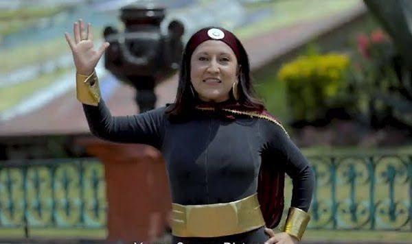 A través de su cuenta de Twitter, la presidenta municipal compartió un video en el que se observa a una mujer vestida con pantalón y blusa negro y capa y diadema en color guinda con detalles dorados, quien se presenta como Susana Distancia.