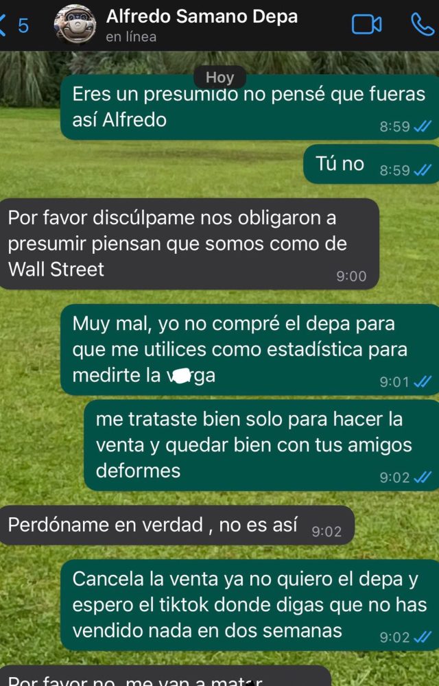Una presunta conversación que tuvo Alfredo Sámano con un cliente (probablemente al que le vendió el ‘depa’ que presumió), y que le reclamó haber utilizado su dinero para presumir logros.