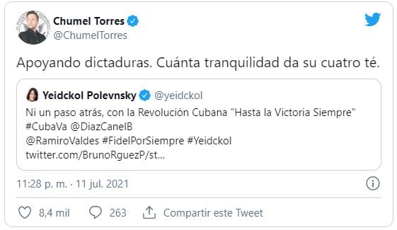 “Apoyando dictaduras. Cuánta tranquilidad da su cuatro té”, escribió Chumel Torres en Twitter.