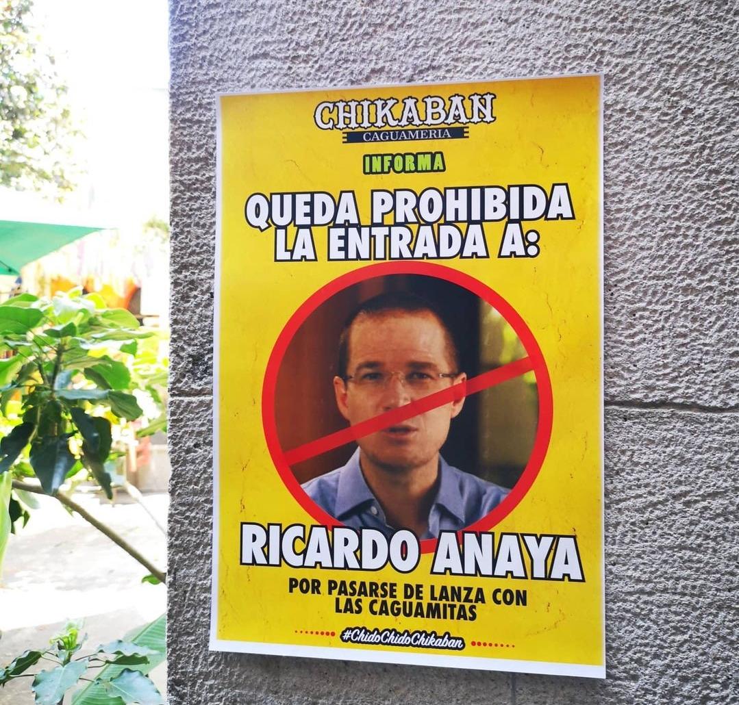 Ricardo Anaya sigue sin ser perdonado por la gente luego que criticara a quienes se gastan todo su dinero en caguamas. Tan es así que ahora un bar de Veracruz ha sacado una publicidad en la que le prohíbe el ingreso al negocio “por pasarse de lanza con las caguamitas”.