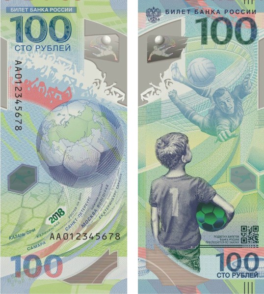 El tercer lugar lo obtuvo el billete ruso de 100 rublos, que muestra a un niño sosteniendo un balón y al portero Lev Yashin, considerado el mejor portero de la historia del futbol.