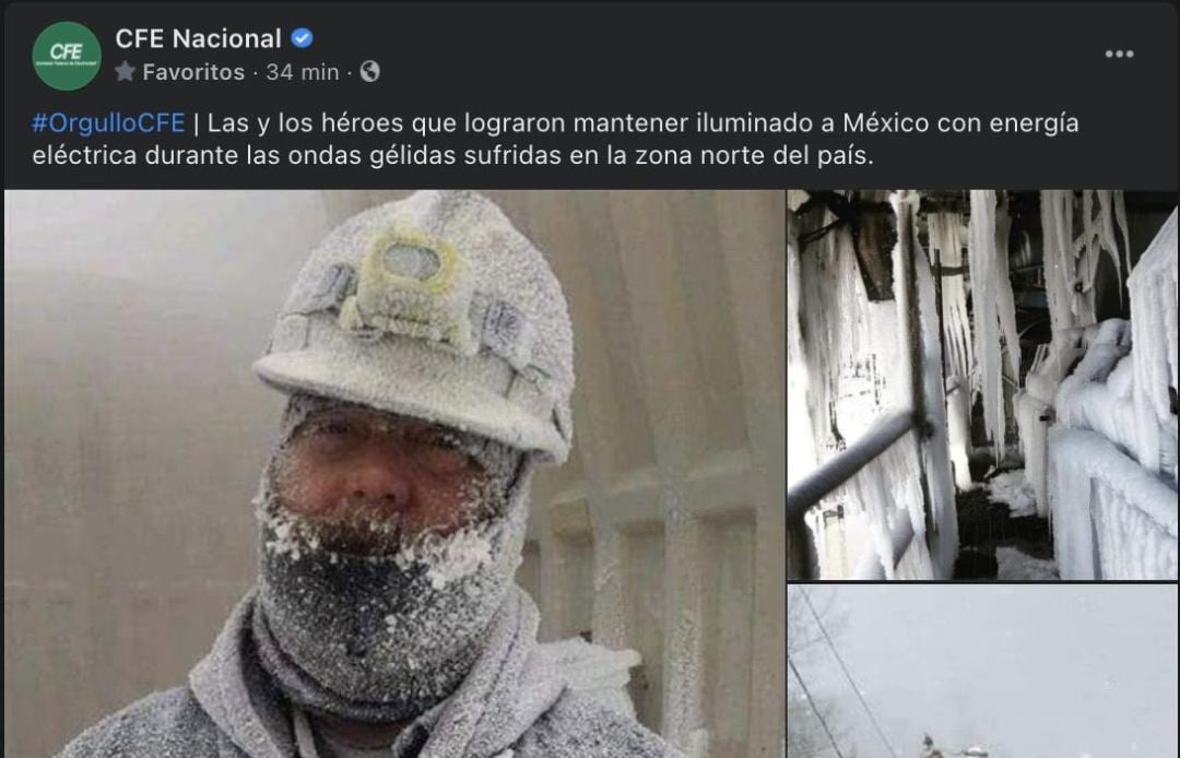 Luego del revuelo generado, y que algunos usuarios calificaron como “perro oso”, la CFE salió a disculparse. Esta vez ya usó una foto de un empleado con el casco con el logo de la empresa del estado y cubierto de nieve.