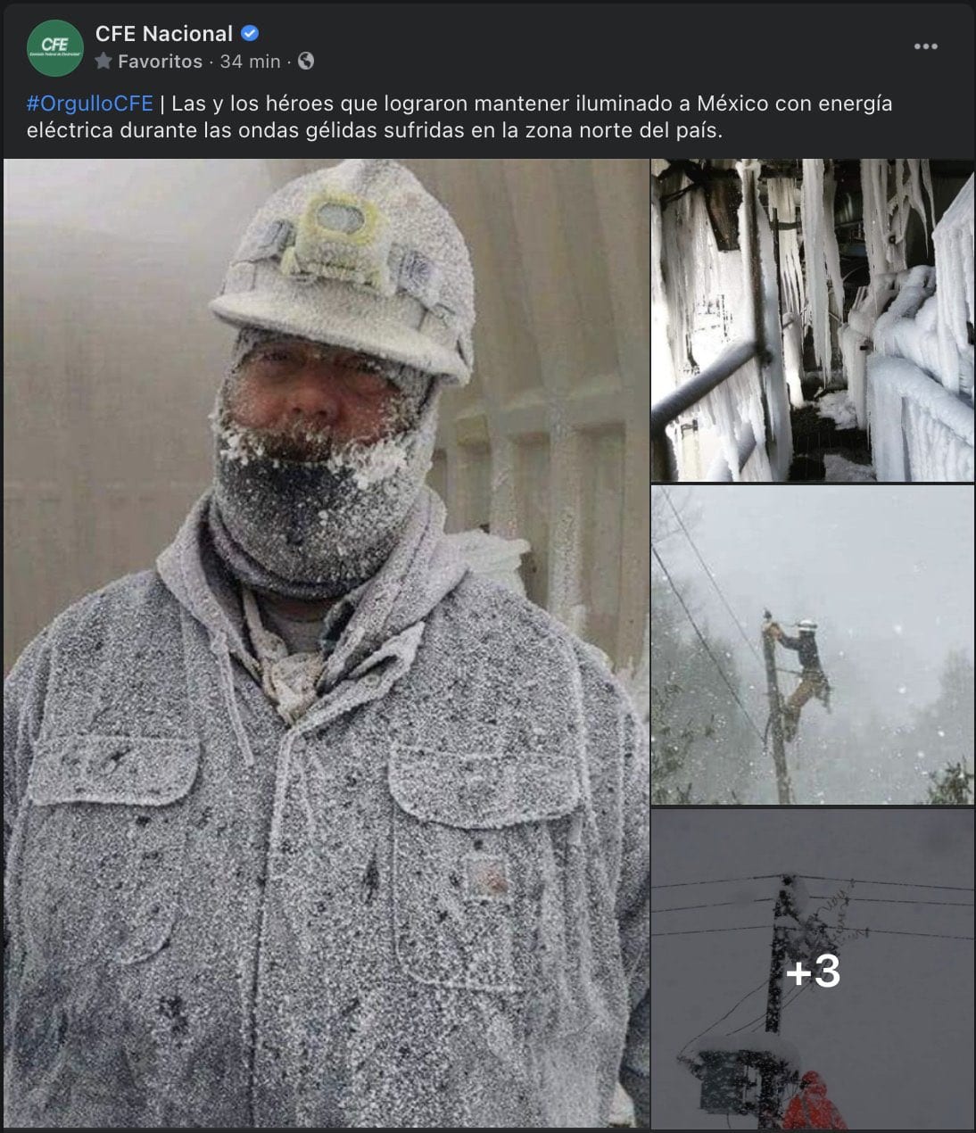 Y es que la CFE compartió un post con imágenes de lo que supuestamente es su personal realizando labores de reparación de las líneas para que haya energia eléctrica en el norte del país. Sin embargo la gente detectó que una de esas imágenes correspondía a la publicidad de una empresa de Estados Unidos.