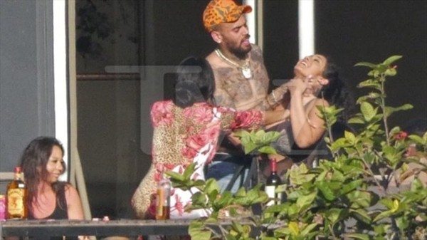 En estas fotografías, Chris Brown agarra del cuello a su víctima, mientras una tercera intenta frenarlo.