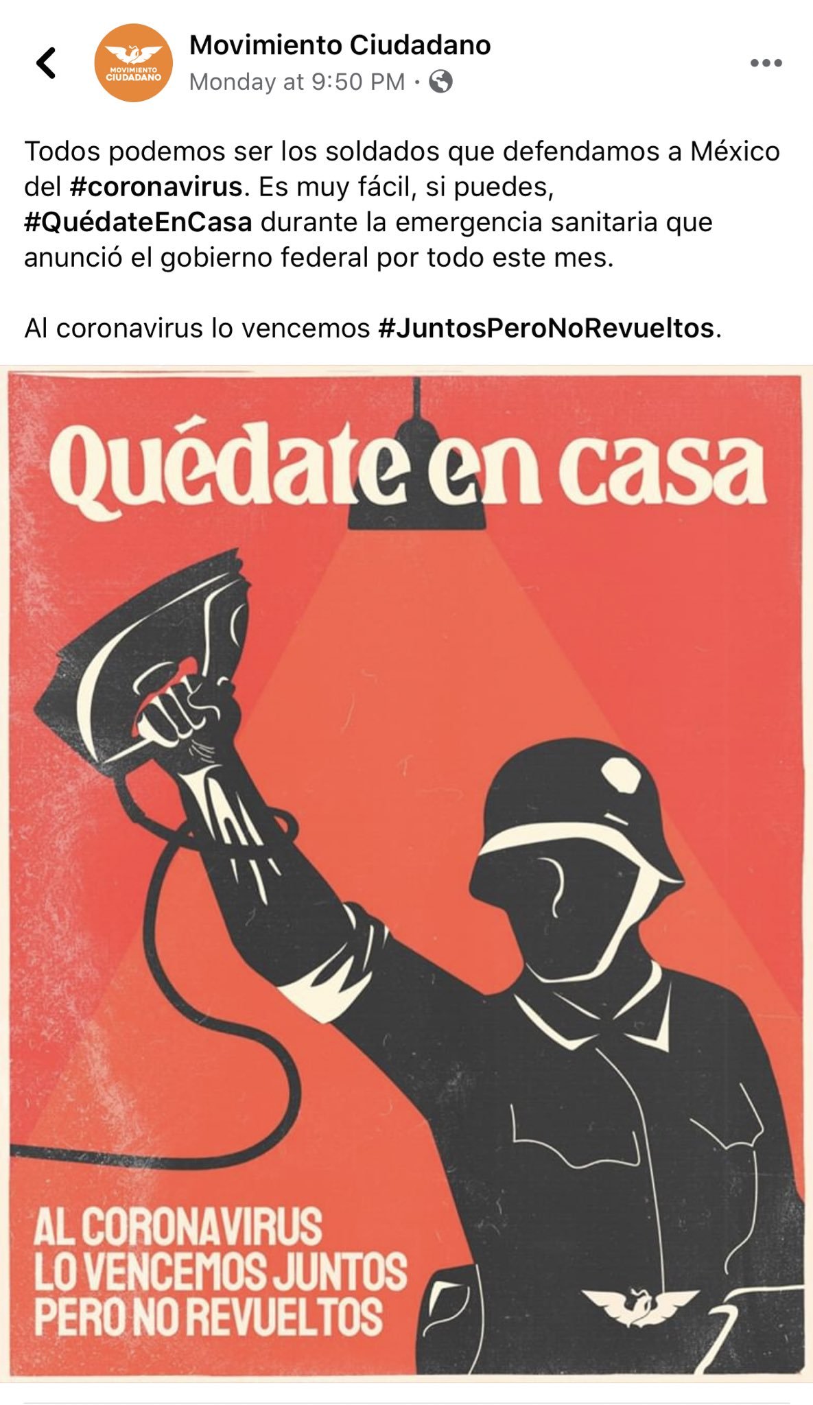 Mediante sus redes sociales, Movimiento Ciudadano compartió la imagen donde se puede ver la silueta de un soldado, levantando una mano con una plancha, un casco y la insignia del partido en la cintura, junto al mensaje “al coronavirus lo vencemos juntos pero no revueltos“.