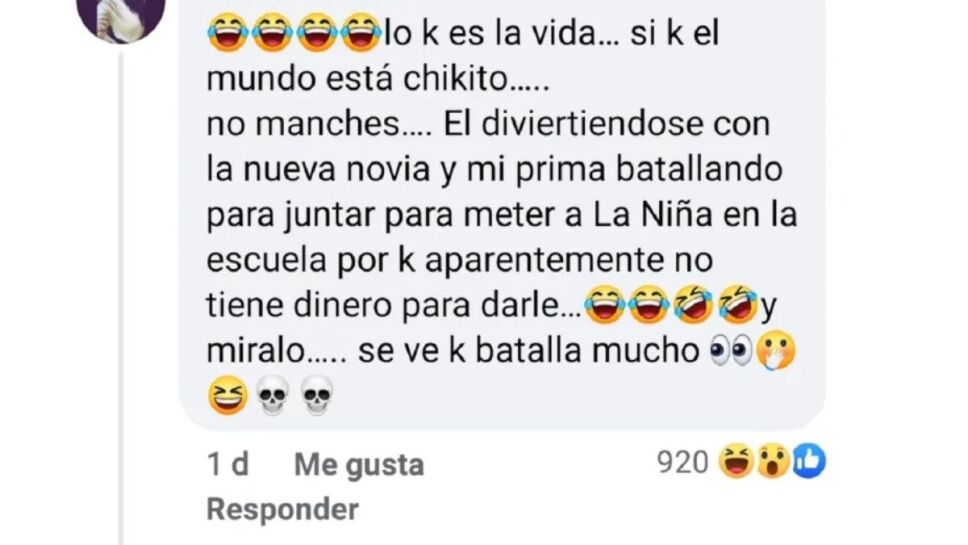 “Lo que es la vida, si que el mundo es chiquito, no manches, él divirtiéndose con la nueva novia y mi prima batallando para juntar para meter a la niña a la escuela”, escribió una mujer debajo de la fotografía. Automáticamente, la publicación comenzó a viralizarse y se llenó de comentarios.