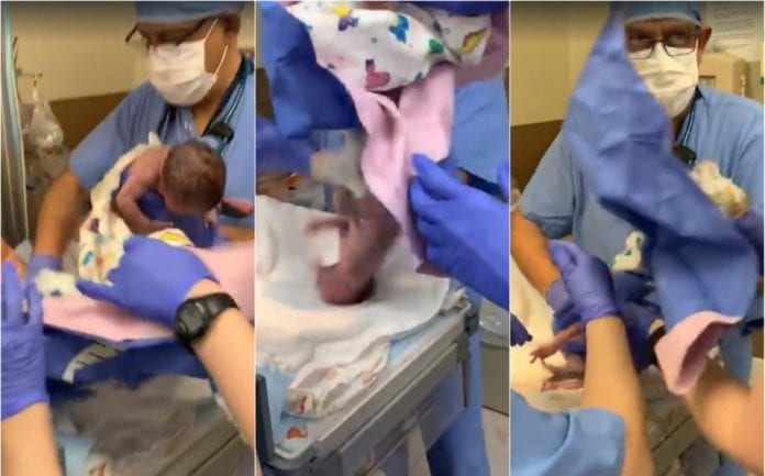 En las imágenes se muestra a los trabajadores del hospital cambiando a la bebé de sábanas, pero el doctor que la sostenía perdió el control y la tiró en la orilla de la tabla, golpeándose en la cabeza.