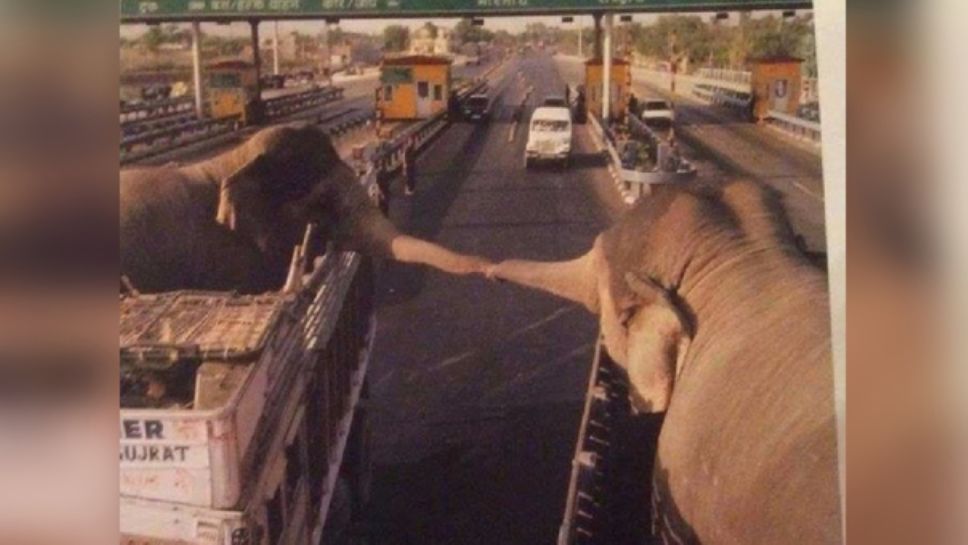 “Esta imagen fue registrada en una carretera de la India, mostrando una pareja de elefantes haciendo un último contacto, antes de ser separados para siempre”.