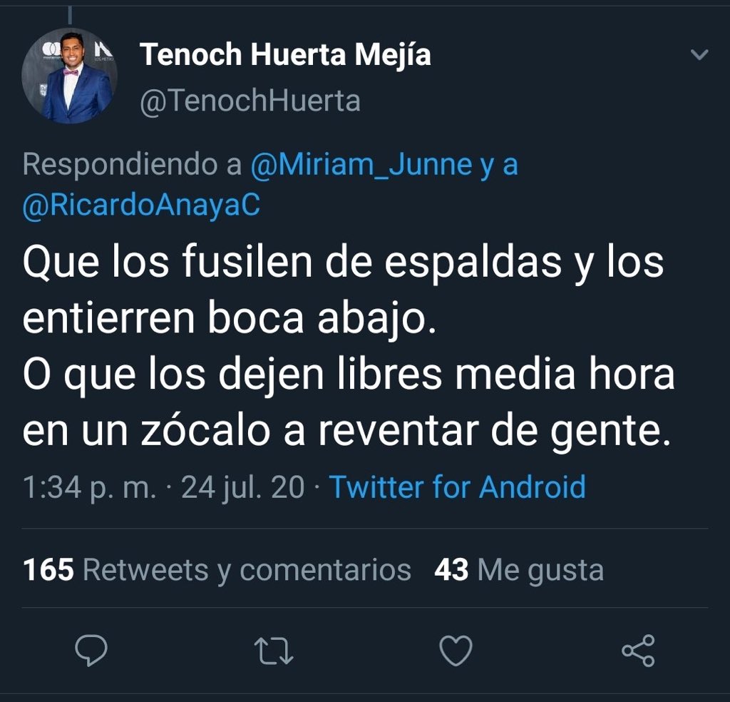 Y dijo que estos sujetos debían ser fusilados y hasta enterrados boca abajo o que los dejaran libres en un Zócalo repleto. Este es el tuit.