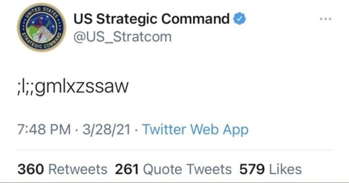 Fue un mensaje de 13 caracteres el que apareció la noche del domingo en la cuenta de Twitter de Stratcom —responsable de supervisar el arsenal nuclear de EU— y acumuló miles de retuits y me gusta en los 30 minutos que transcurrieron antes de que se eliminara.