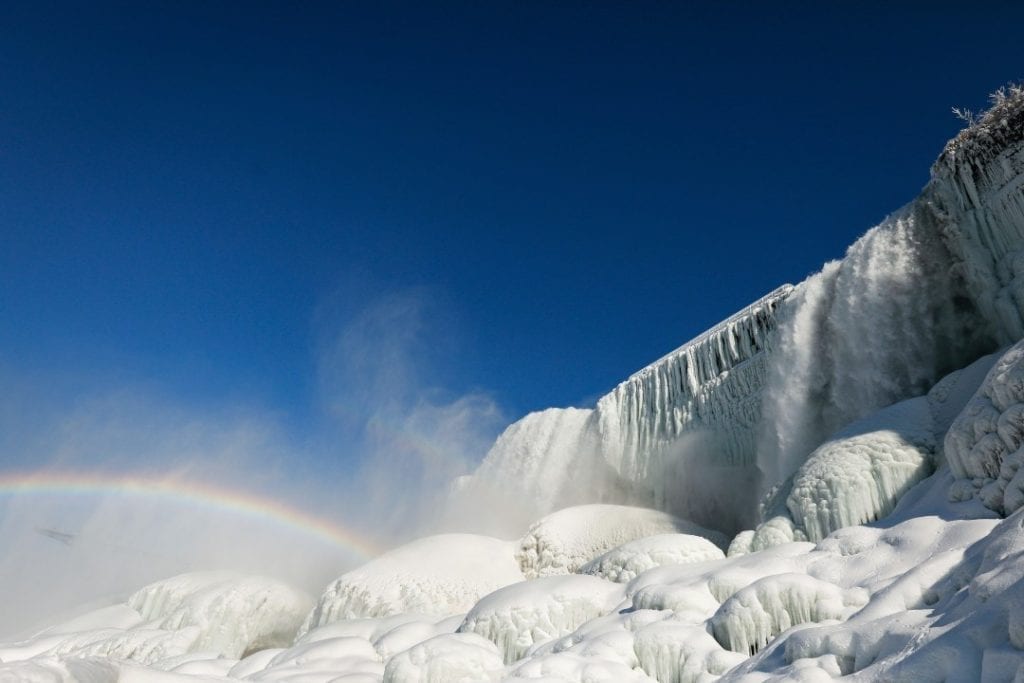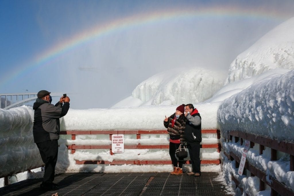 Aunque no es infrecuente que se congelen las aguas del Niágara, nadie esperaba que las cataratas congeladas se vieran coronadas por un imponente arcoíris.