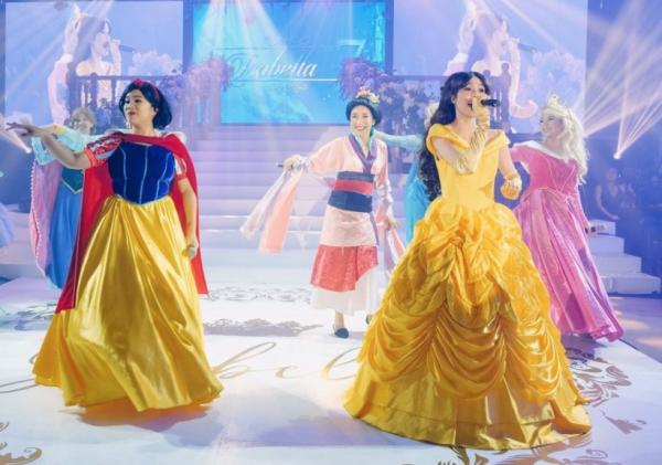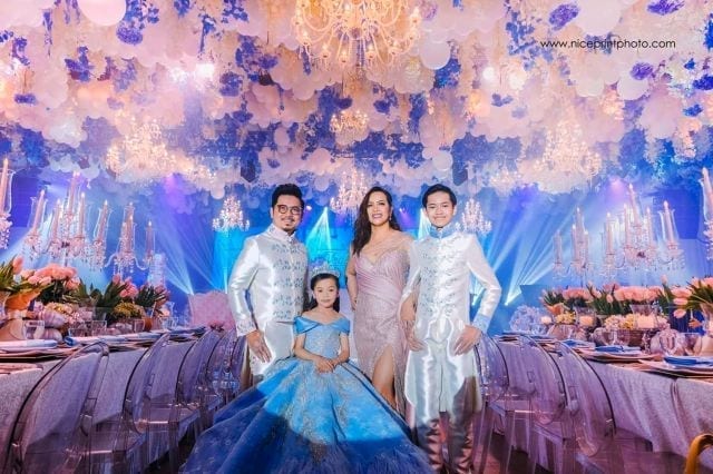 Además la enorme escalera del salón fue adornada con flores y un piso con el nombre de la pequeña Isabella, a quien sus padres complacieron con un show de princesas filipinas de Disney y que le cantaron sus canciones favoritas.