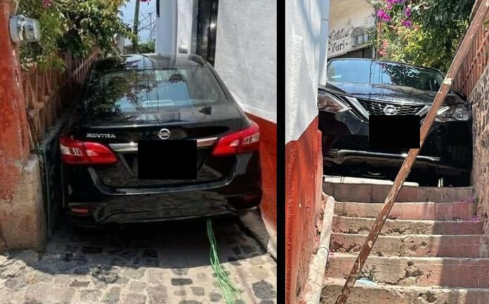 Las imágenes fueron compartidas en redes sociales y muestran que el automóvil quedó atorado al intentar pasar por un estrecho callejón con escaleras, culpando al GPS