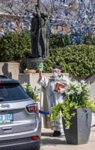 En las imágenes se ve al sacerdote Pelc, con guantes y mascarilla, parado en los escalones de su parroquia durante la pasada Pascua mientras usa la pistola para rociar agua bendita sobre canastas que le acercan conductores desde sus autos.