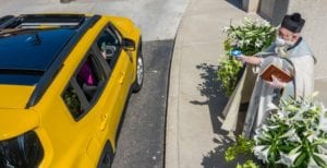 “Adaptándose a la necesidad de distanciamiento social, la parroquia de San Ambrosio continuó con su tradición de bendición de canastas de comida de Pascua, al estilo de autoservicio”, indicó la parroquia en su página de Facebook, y agregó: “Sí, ese es el padre Tim usando una pistola de agua llena de agua bendita”.